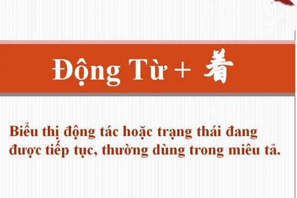 Định nghĩa: Trợ từ “着 (zhe)” được đặt sau động từ để biểu thị trạng thái hoặc hành động đang tiếp diễn, hoặc một trạng thái duy trì, tồn tại song song với hành động khác.
